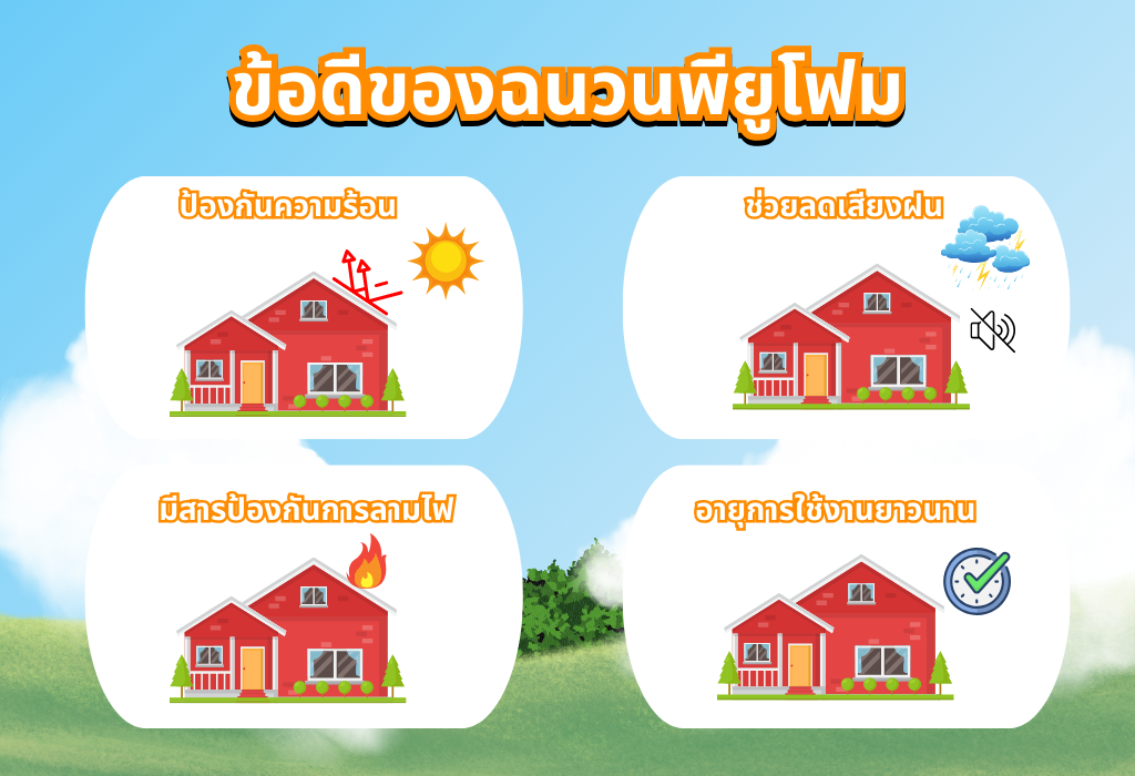 ดังนั้นการแก้ไขปัญหาที่ต้นเหตุให้ถูกต้องและถูกจุดก็คือการป้องกัน สกัดกั้นไม่ให้ความร้อนจากภายนอก เข้าภายในอาคารหรือให้ความร้อนส่งผ่านจากด้านนอกเข้ามาในอาคารให้น้อยที่สุด อีกทั้ง หลังคาพียูโฟมเมทัลชีท ยังช่วยดูดซับการสะท้อนของเสียงภายในอาคารและ ลดการเกิดเสียงที่เกิดเมื่อฝนกระทบกับแผ่นหลังคาเมทัลชีท ครบทั้งคุณสมบัติและคุ้มค่าด้านราคา จึงเป็นที่มาของฉนวนกันความร้อนพียูโฟม หรือฉนวนป้องกันความร้อนที่ดีที่สุดในปัจจุบัน